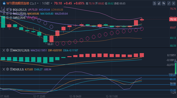 【原油消息面分析】:周三(12月18日),国际原油市场延续震荡上涨走势,市场的关注焦点集中在即将公布的美联储利率决议,投资者在美联储可能进一步降息的预期中保持谨慎,同时关注欧盟加大对俄罗斯石油运输的制裁力度,这也为油价带来了支撑。
