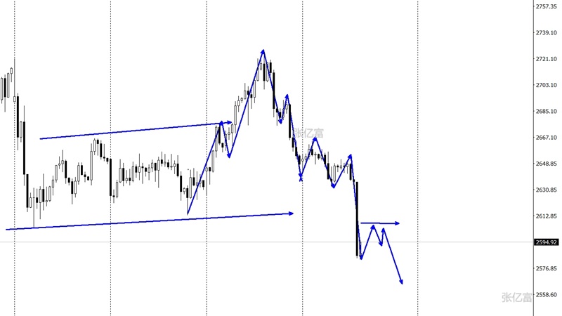 黄金昨日震荡下跌,在2652美元遇阻承压下破,美盘时段下破新低,直接触及2583一带徘徊,收盘在2585美元。日线级别收录一根大阴线,高价没有破前高,低价破前低,出现了落尾走势,后市延续看跌思路。四小时级别上看,布林带开口向下,均线系统粘连之后死叉向下发散中,黄金下破前期支撑位2603一带,形成向下延续,今日关注黄金承压迹象。综合以上分析,张亿富总结:黄金空头趋势延续,今日操作上考虑反弹做空为主,上方关注2604-2616美元阻力,下方关注2550-2540美元支撑。