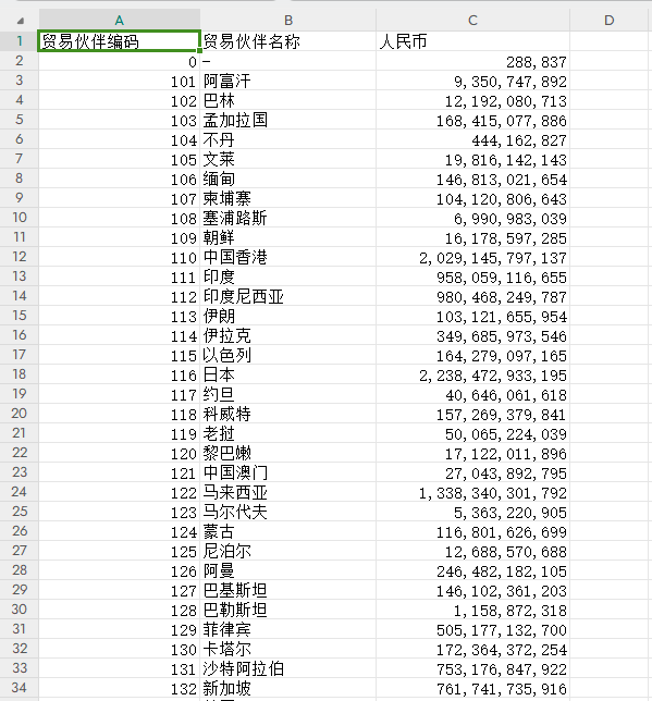 2018-2023年中国海关按贸易伙伴国家分类的数据