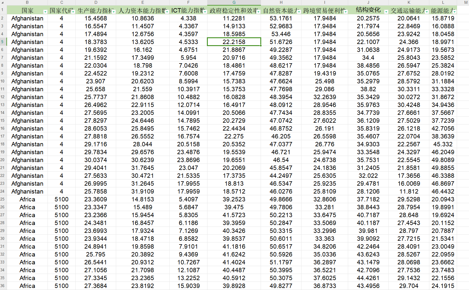 5.自然资本能力:估计采掘和农业资源的可用性,包括开采自然资源产生的租金,减去开采资源的成本。为了捕捉商品依赖性,自然资本随着物质强度的增加而减少。