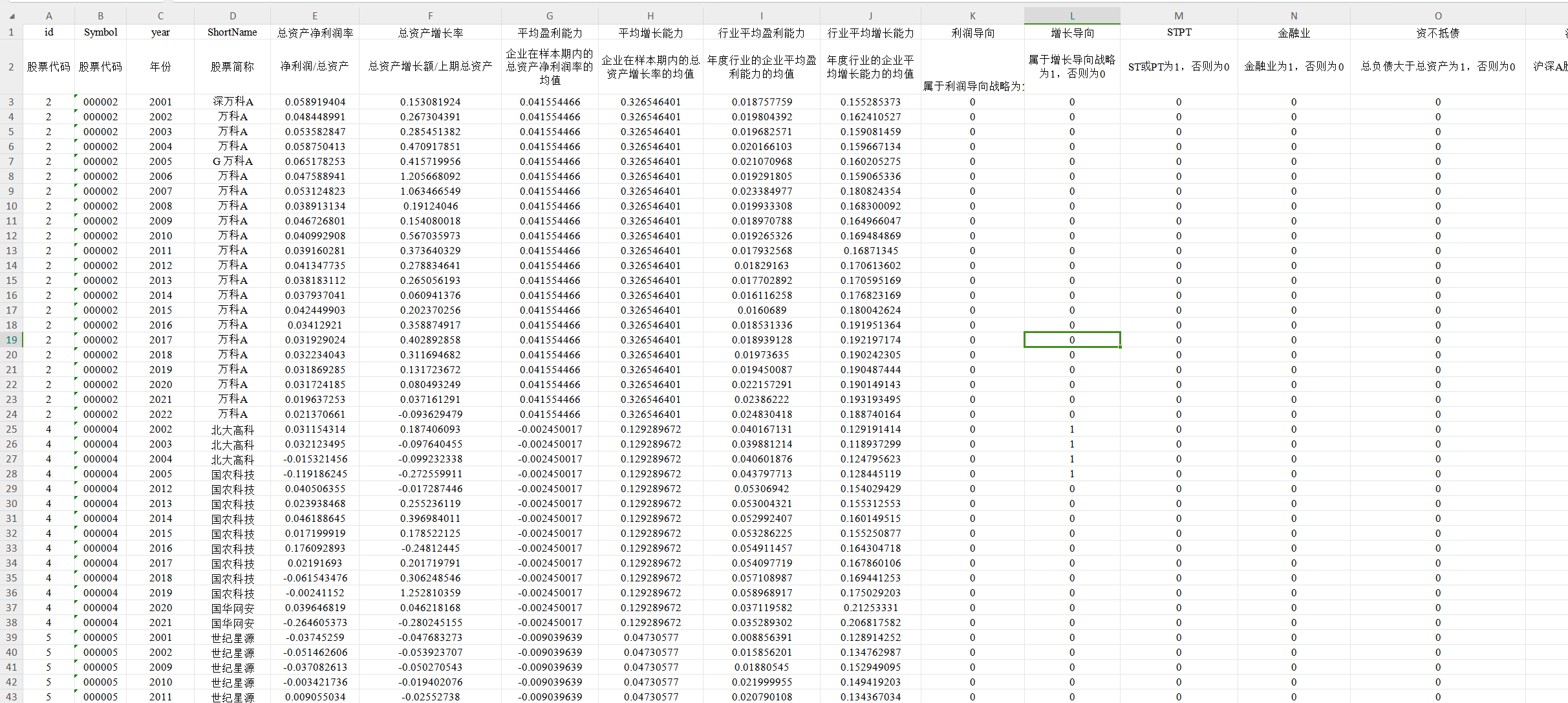 首先计算企业在样本期内的平均盈利(或增长)能力,再计算行业平均值:如果企业在样本期内的盈利能力高于行业平均水平并且增长能力低于行业平均水平,则将其识别为利润导向,值为 1 否则为 0;如果企业在样本期的增长能力高于行业水平并且盈利能力低于行业水平,则将其识别为增长导向,值为 1 否则为 0。