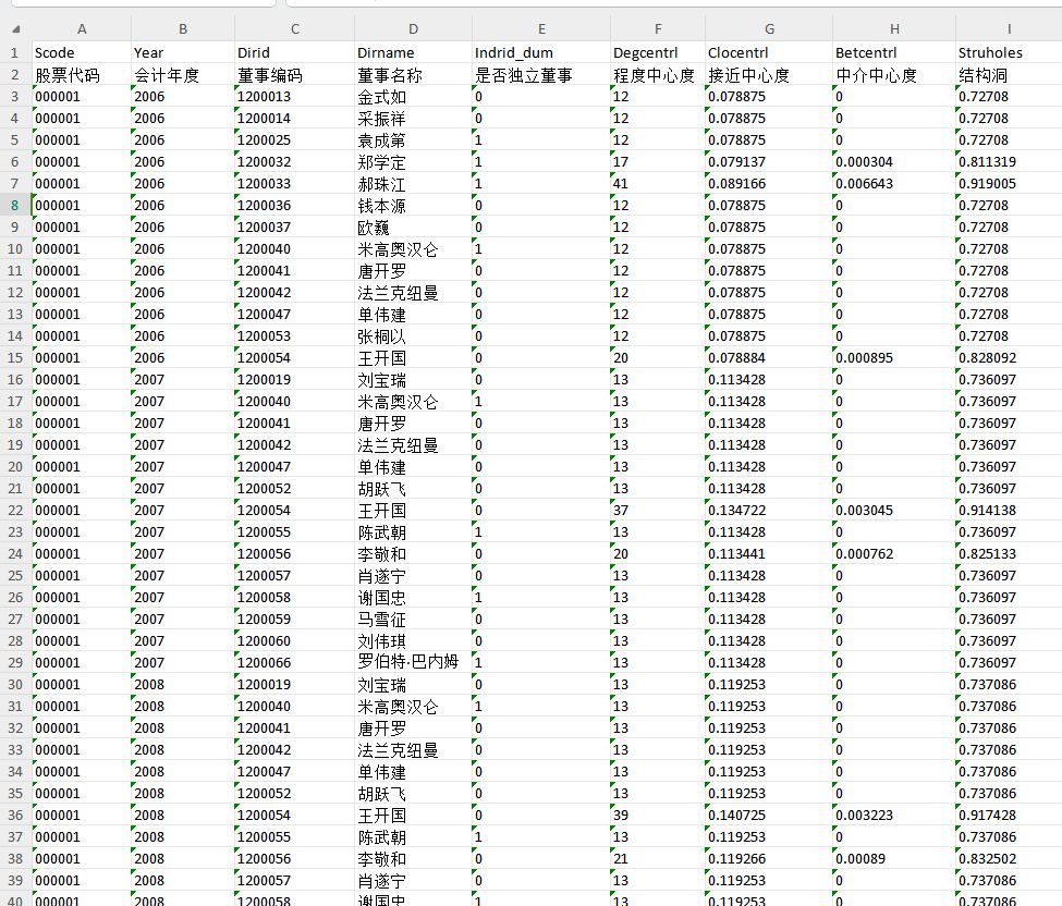 50多万个样本,5600多家企业,具体指标为股票代码 会计年度 董事编码 董事名称 是否独立董事 程度中心度 接近中心度 中介中心度 结构洞(最终结果)