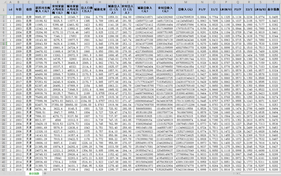 一、资源名称:2000-2023年31省泰尔指数/城乡收入差距:原始数据+计算过程+参考文献+计算结果