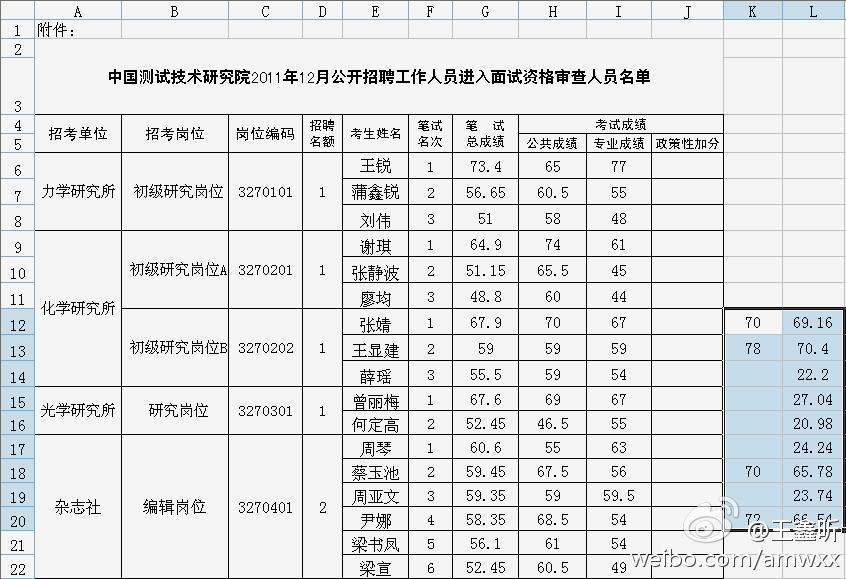 网友jb201112推测,最右边的两列数字分别是面试成绩和考试总成绩。