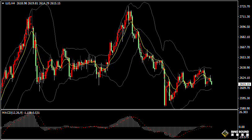 金价4小时图看,金价布林带三轨持续走平,金价维持在布林中下轨附近盘整;短线均线EMA5与EMA10胶结后有所向下,MACD指标负动能柱相对较小,RSI指标回落至44位置附近运行。晚间短线操作建议,先看金价在2607-2628区间振荡运行,如突破该区间时,上行目标在2638-2642、或2650附近;下行目标在2600-2595、或2590附近。
