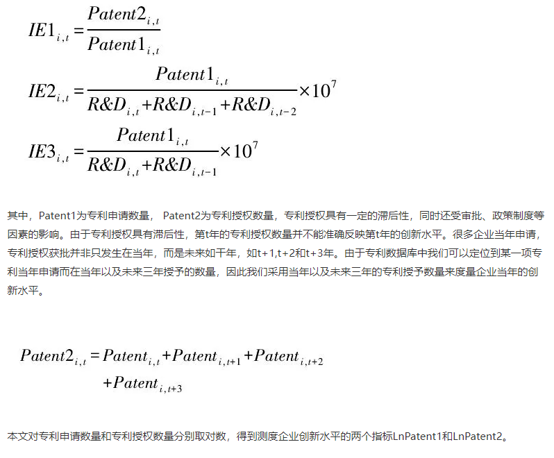 一些学者认为,专利数是企业当年和历史相关研发支出的函数( Hirshlifer等,2013) 。因此,以专利授权数量与专利申请数量的比值( IE1)、专利申请数量与当年及前两年研发支出之和的比值( IE2)、专利申请数量与当年及前一年研发支出之和的比值(IE3)来衡量企业创新效率( Innovation Efficiency)。由于创新效率数值较小,为了便于观测创新效率,将IE2和IE3均扩大10。具体计算方法如下:
