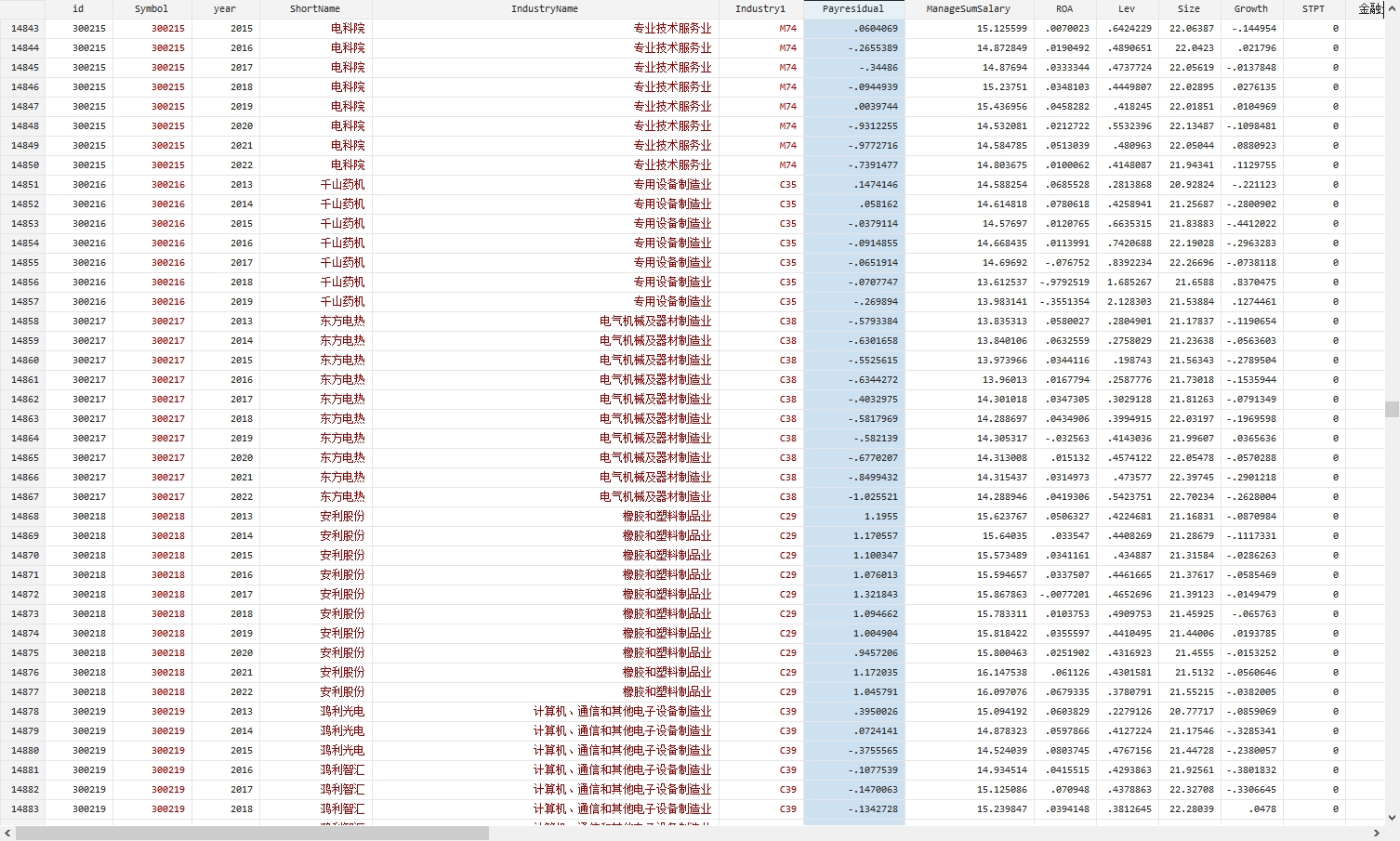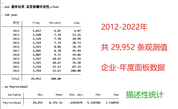 方法:复刻了袁淳老师2023年文献做法,通过狭义全部高管的薪酬总额、企业规模、盈利能力、企业成长性等指标进行OLS回归拟合,得到实际薪酬与期望薪酬之差作为衡量薪酬契约有效性的代理变量(Payresidual),该变量越大,薪酬契约有效性越低。