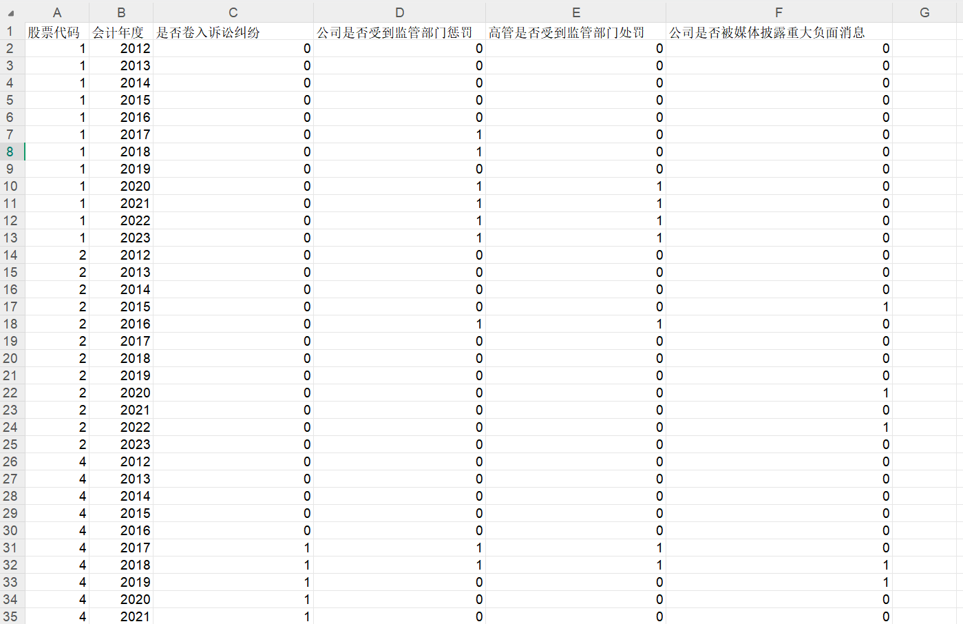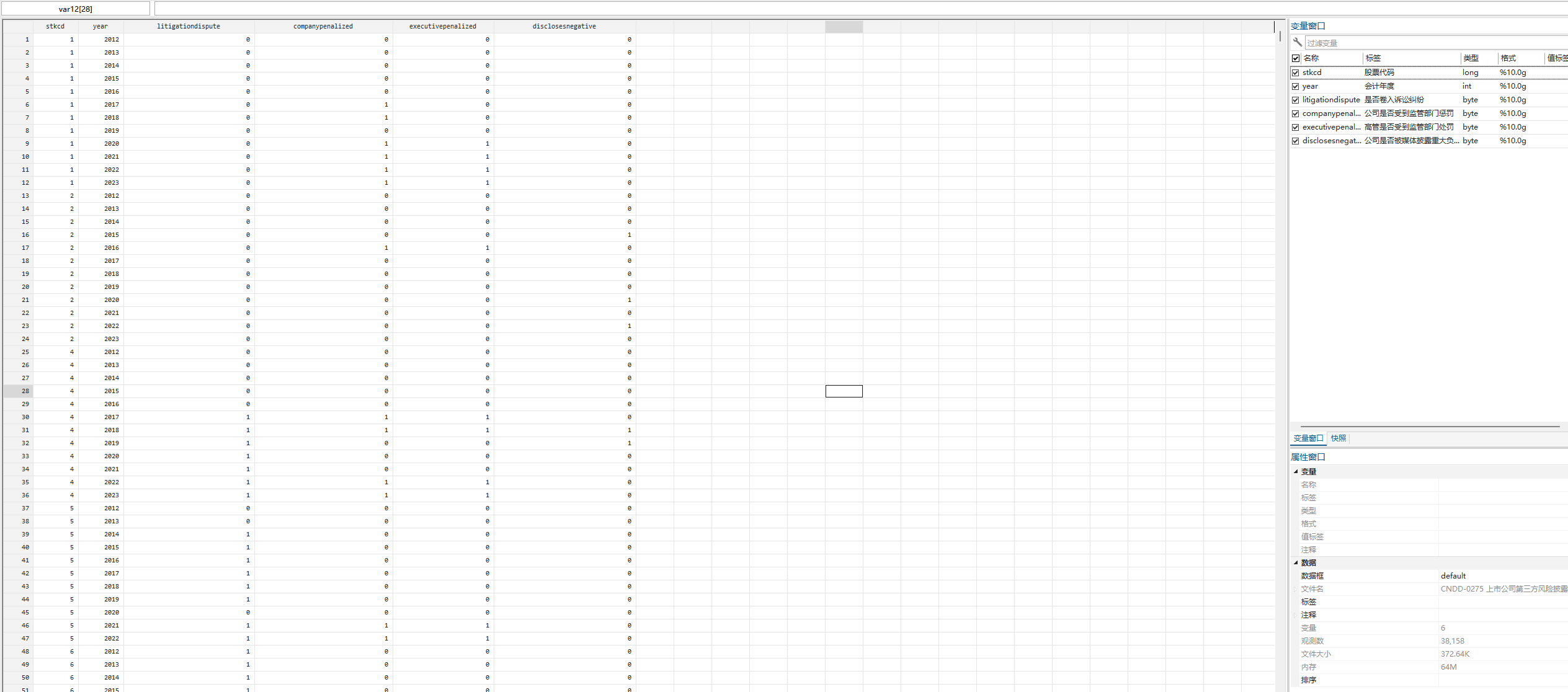 上市公司第三方风险披露情况的多个变量,记录了不同上市公司在特定会计年度内,是否卷入诉讼纠纷、公司是否受到监管部门惩罚、高管是否受到监管部门处罚、公司是否被媒体披露重大负面消息等变量。若是则为“1”,若否则为“0”。数据提供.dta和.xlsx两种格式,可用stata或Excel打开。