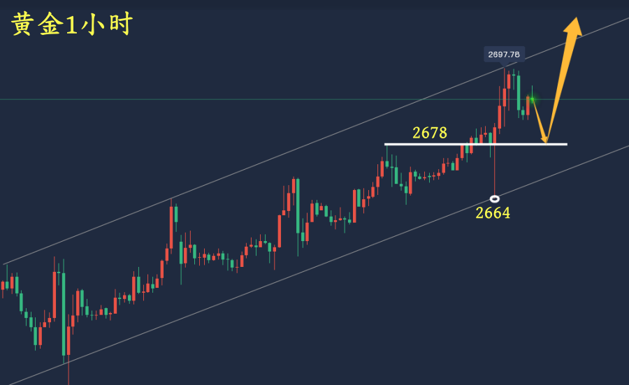 周五最后收盘在2690附近,这个位置相对较高,周一开盘后不建议在高位直接多,等回调修正重点关注2678—2680一线看多,如果欧盘连阳上升强势站上2700关口,晚间回踩可以看二次多,破高的越早行情越强势,看多就更稳。
