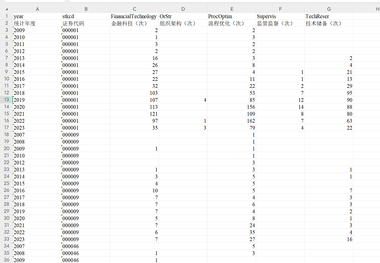 数据说明:金融上市公司金融科技化统计了金融上市公司年报中含有的相关词频总数,包括股票代码、统计年份、金融科技相关词频数、组织架构相关词频数、流程优化相关词频数、监管监督相关词频数、技术储备相关词频数等变量,数据包括.xls和.dta格式,可用excel和stata打开。