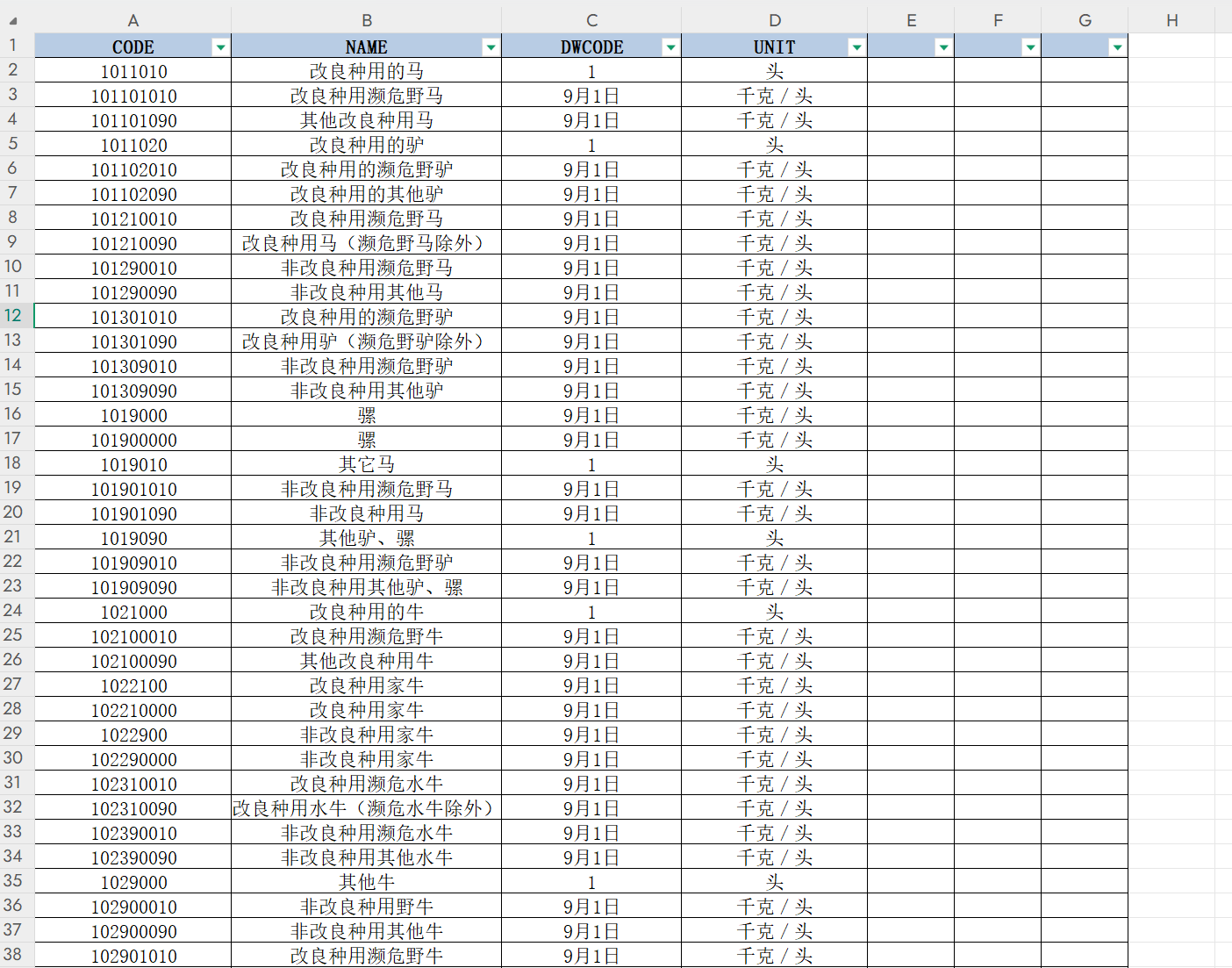 CODE、ST_DATE、END_DATE、ZHCMCODE、NAME、DWCODE、UNIT、BCFLAG、STDFLAG、DWFLAG、SZ、ZSSL_SET、CLDE、CJDL、TSL、SPLB、TSFLAG、NOTE。