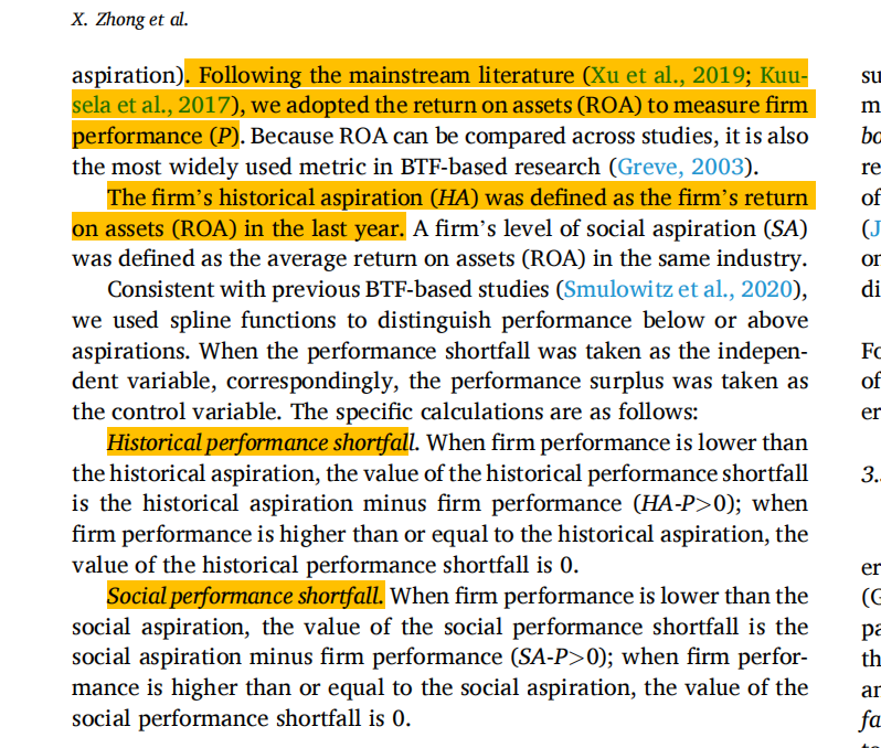 社会期望落差:社会期望落差则是企业将自身绩效与同行业其他企业的绩效进行比较。企业会根据同行业其他企业的平均表现设定一个社会期望水平,如果当前绩效低于这一社会期望水平,就会产生社会期望落差。这种落差促使企业采取行动,以追赶或超越同行业其他企业的表现。社会期望落差的设定基于社会比较理论,反映了企业对行业竞争环境的认知和对自身在行业中地位的评估