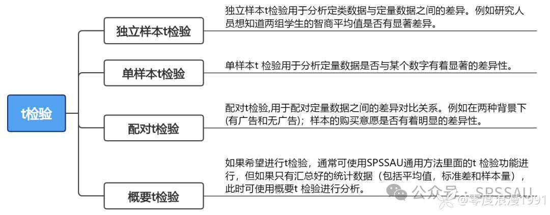 t检验,用于分析定类数据与定量数据之间的差异情况,按照研究内容和数据类型等不同,可分为以下几类: