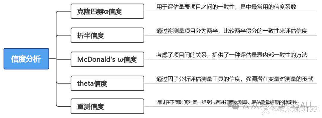 信度是指测量工具在重复测量同一对象时,所得结果的一致性和稳定性。常见的有以下5类信度系数:Cronbach α信度系数、折半信度、McDonald's ω信度、theta信度、重测信度。