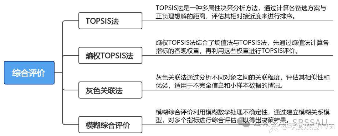 综合评价是一种方法,用于对多个方案或对象进行比较和排序,以确定其优劣程度,通常基于多个指标的综合得分。常用的综合评价方法有TOPSIS法、熵权TOPSIS法、灰色关联法、模糊综合评价等。