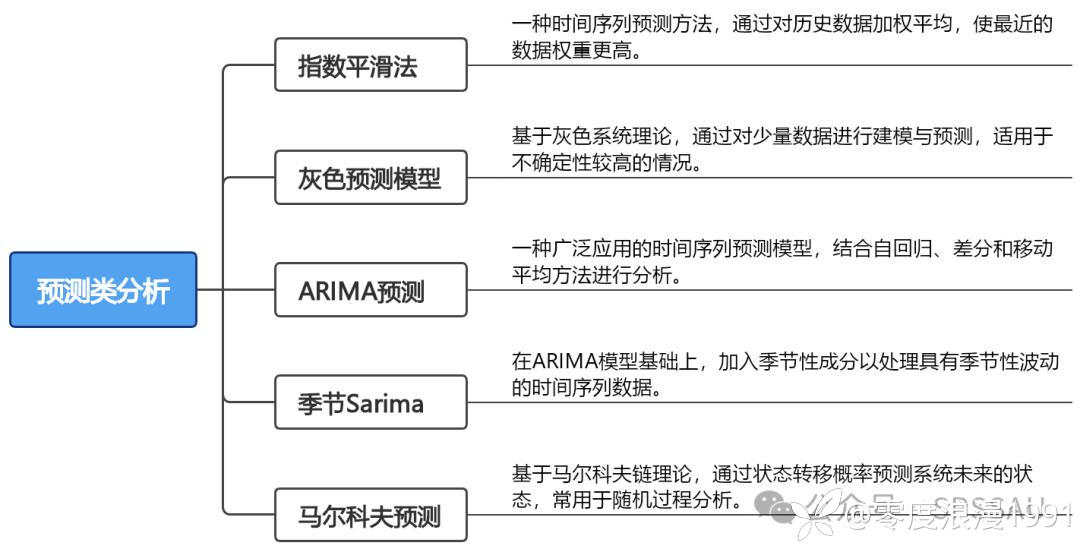 根据历史数据进行数据预测,常用的预测类分析方法包括指数平滑法、灰色预测模型、ARIMA预测、季节Sarima法、马尔科夫预测等。