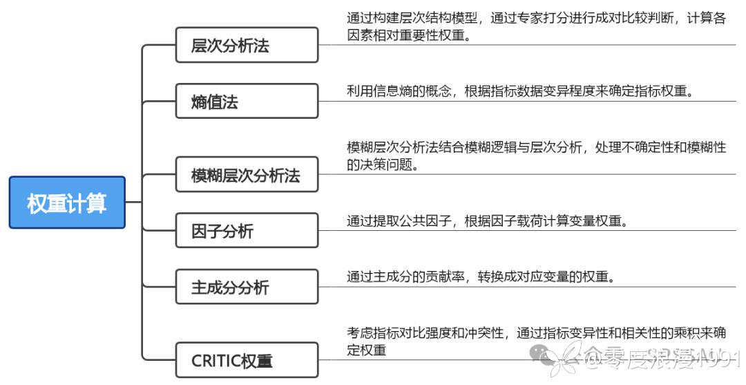 权重研究是用于分析各因素或指标在综合体系中的重要程度,最终构建出权重体系。权重计算的方法有很多种,包括主观赋权法、客观赋权法,也可进行组合赋权,下面是一下相对常用的指标权重计算方法: