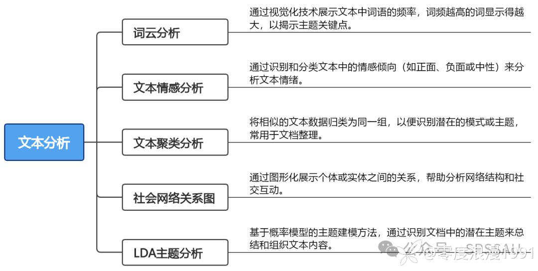 文本分析是一种对文本数据进行处理和理解的技术,旨在从中提取有用的信息和见解。针对文本数据可进行词云分析、文本情感分析、文本聚类分析、社会网络关系图、LDA主题分析。说明如下: