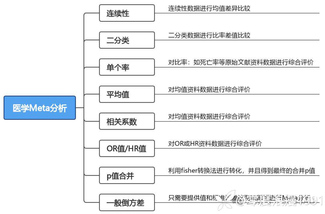 Meta荟萃分析是一种综合各种文献结论,进而汇总综合评价的方法。按照数据类型,Meta分析可包括多种类型,比如连续性数据进行均值差异比较,二分类数据进行比率差值对比(或计算优势比OR值,相对危险度RR值等),当然SPSSAU中还包括单个率、相关系数、平均值,或者OR值/HR值的Meta分析等,并且提供一般倒方差法时的Meta分析。