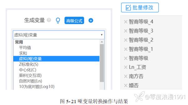 依次选择【数据处理】→【生成变量】模块,先在左侧的变量列表中选中“智商等级”,然后在右侧【生成变量】功能下拉框内选择常用的【[color=var(--dui-color-purple-p9)]虚拟(哑)变量】功能,最后单击底部的【确认处理】,操作设定如图 5-21所示。转换后,原始数据中新增“智商等级_1” ~“智商等级_4”4个哑变量,分别对应的是“智商等级”的四个水平。此处应注意,应选择其中一个水平作为参照,本例选择“智商等级_1”即第一个水平作为参照,其余三个哑变量参与接下来的线性回归。