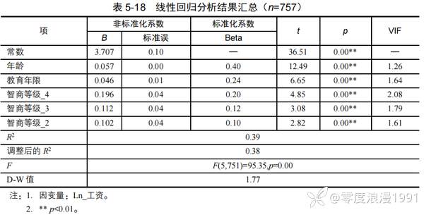 (2) [color=var(--dui-color-purple-p9)]偏回归系数检验,“年龄”和“教育年限”2个自变量,以及智商等级的3个哑变量,t检验p值全部小于0.01,说明这5个自变量对“Ln_工资”的影响有统计学意义。相对于“智商等级_1”来说,由智商等级_1变换到等级_2,工资水平增加10%;等级_1变换到等级_3,工资水平增加11%;等级_1变换到等级_4,工资水平增加20%,可见智商对工资的影响。