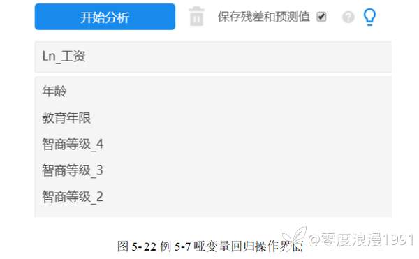 本例以“智商等级_1”为参照,将“智商等级_2” ~“智商等级_4”这三个哑变量拖拽至【X(定量/定类)】。勾选【保存残差和预测值】,最后单击【开始分析】。