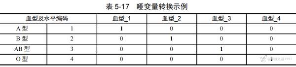 如表5-17所示,哑变量“血型_1”的编码1对应的是“A型”,编码0则表述“非A型”,该哑变量代表的就是“A型”血型;哑变量“血型_2”则对应“B型”;哑变量“血型_3”则对应“[color=var(--dui-color-purple-p9)]AB型”;哑变量“血型_4”则对应“O型”。同一个分类变量转换所得的多个哑变量,一般简称为“一组”或“一簇”哑变量。
