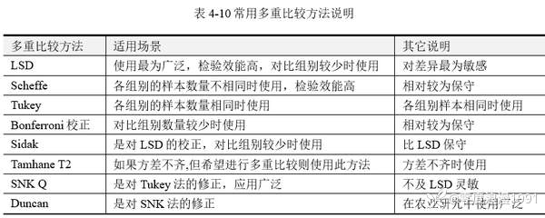 事后多重比较的方法有多种,[color=var(--dui-color-purple-p9)]SPSSAU【事后多重比较】模块中共提供LSD、Scheffe、Tukey、Bonferroni校正、Sidak、Tamhane T2、SNK、Duncan检验等8种常用方法,如表 4‑10所示。