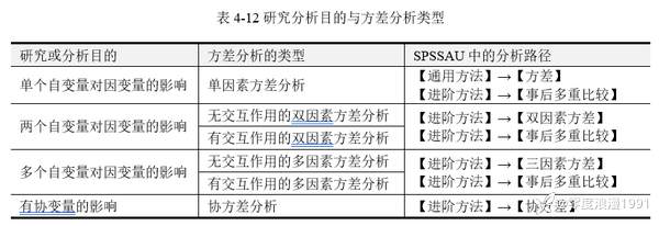 根据研究分析目的的不同,可使用单因素、双因素、多因素方差分析以及[color=var(--dui-color-purple-p9)]协方差分析。有两个及以上因素时,又可分为有交互作用的方差分析和无交互作用的方差分析。研究分析目的与方差分析类型,见表 4‑12。[color=var(--dui-color-purple-p9)]SPSSAU平台在【通用方法】、【进阶方法】两个功能下,共提供6个独立的模块来完成各种类型的方差分析。