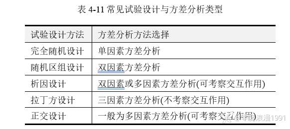 通常情况下,方差分析与[color=var(--dui-color-purple-p9)]科学试验设计相辅相成。在考虑使用方差分析方法时,应结合研究分析目的及科学试验所用的设计方法进行综合考虑。常见试验设计与方差分析方法类型的选择思路,见表 4‑11。