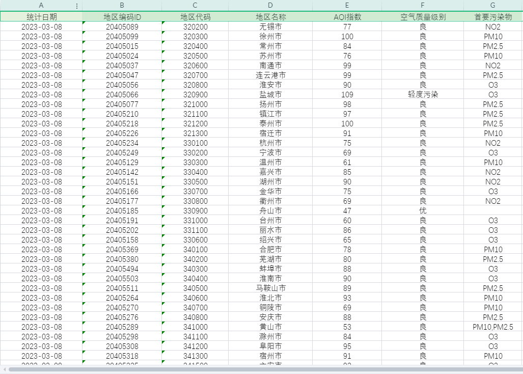 主要指标:地区名称、API指数、空气质量级别、首要污染物
