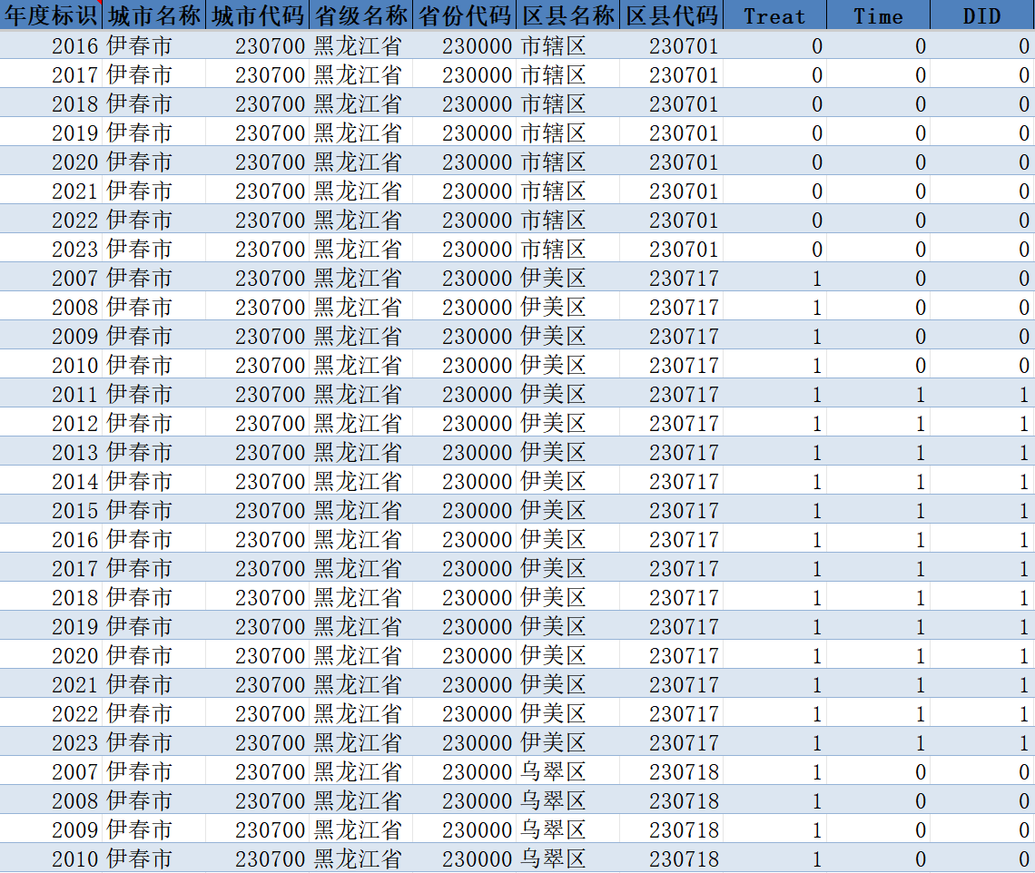若样本区县为重点生态功能区,则赋值为 1,否则为 0;Post为年份虚拟变量,在数据中为Time,需要注意的是,2011年名单中的区县,在2011年及以后得年份取1,否则为0,2017年同理。