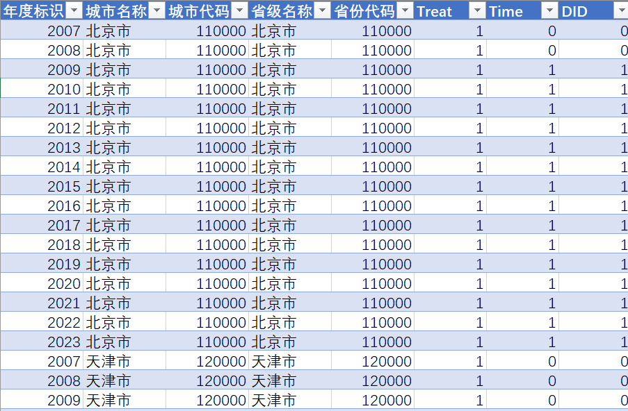 年度标识 | 城市名称 | 城市代码 | 省级名称 | 省级代码 | Treat | Time | DID |