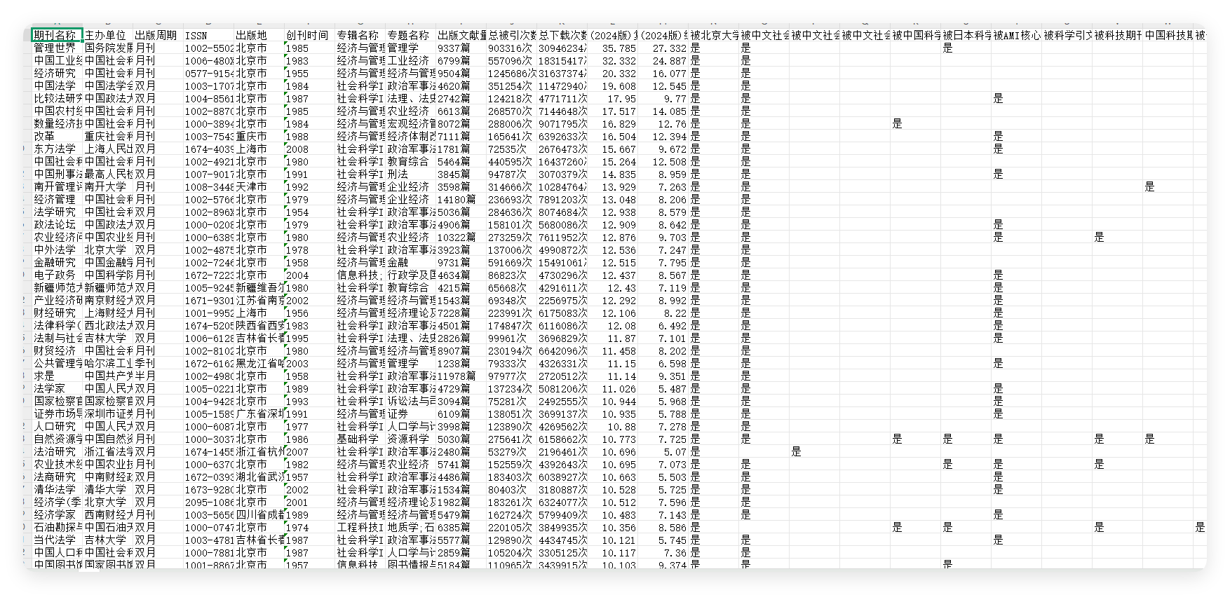 所含指标:期刊名称、主办单位、出版周期、ISSN、出版地、创刊时间、专辑名称、专题名称、出版文献量、总被引次数、总下载次数、(2024版)复合影响因子、(2024版)综合影响因子、被北京大学《中文核心期刊总览》来源期刊收录、被中文社会科学引文索引(2021-2022)来源期刊收录、被中文社会科学引文索引(2021-2022)来源期刊(扩展版)收录、被中文社会科学引文索引(2017-2018)来源集刊收录、被中国科学引文数据库来源期刊(2023-2024年度)收录、被日本科学技术振兴机构数据库(日)(2024)收录、被AMI核心收录、被科学引文索引(美)(2024)收录、被科技期刊世界影响力指数报告(2023)来源期刊收录、中国科技期刊卓越行动计划入选项目、被化学文摘(美)(2024)收录、被文摘杂志(俄)(2020)收录、被中国科学引文数据库来源期刊(2023-2024年度)(扩展版)收录、被AMI集刊核心收录、被AMI入库收录、被AMI扩展收录、被AMI职院刊入库收录、被AMI集刊入库收录、被AMI职院刊核心收录、国家社科基金资助期刊、被AMI新刊入库收录、被AMI职院刊扩展收录、被AMI权威收录、被科学文摘(英)(2024)收录、被工程索引(美)(2024)收录、被AMI新刊核心收录、被AMI外文刊核心收录、被AMI外文刊入库收录、被AMI外文刊权威收录、被AMI顶级收录