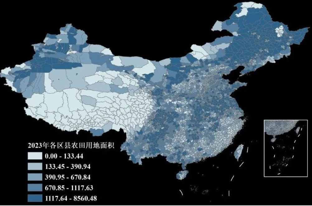 每个Shp文件汇总年度各类土地覆盖面积,数据字段包括9种用地面积,分别为农田(Cropland)、森林(Forest)、草原(Grassland)、水域(Water)、裸地(Barren)、不透水面(Impervious)、灌木(Shurb)、湿地(Waterland)、冰雪(Snow_Ice)。我们以2023年的农田数据为例来预览一下各区县的数据: