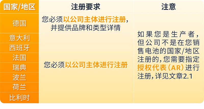 请中国卖家注意,根据欧盟电池法规,如果您是生产者,但公司不是在您销售电池的国家/地区注册的,则必须指定一名在销售电池的国家/地区注册公司的授权代表(AR)并通过他们进行注册。