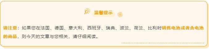 欧盟针对电池法规的生产者责任延伸要求将于2025年8月18日生效,如果您在欧盟销售电池或者含电池的商品,需要在法规生效前确保您的商品符合亚马逊的规定,以确保您能在亚马逊上顺利销售这些商品。