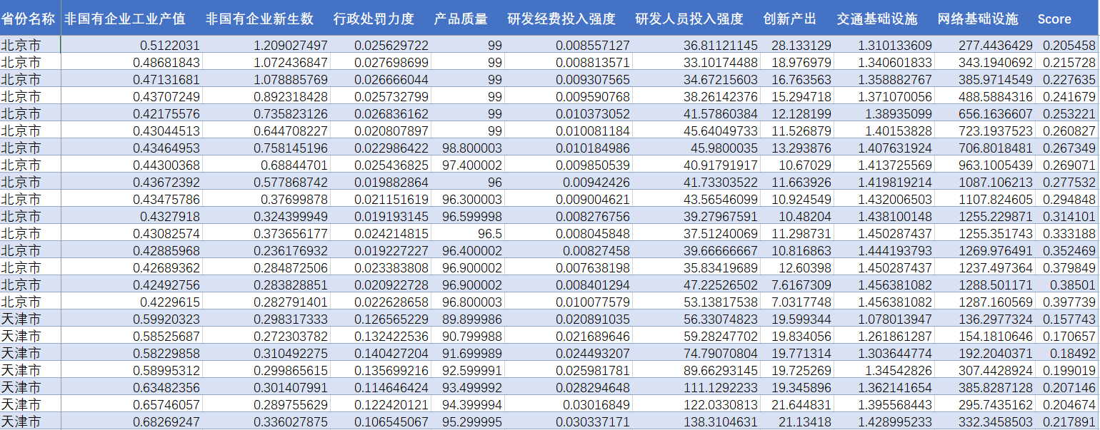 产品质量 | 研发经费投入强度 | 研发人员投入强度 | 创新产出 | 交通基础设施 | 网络基础设施 | Score |