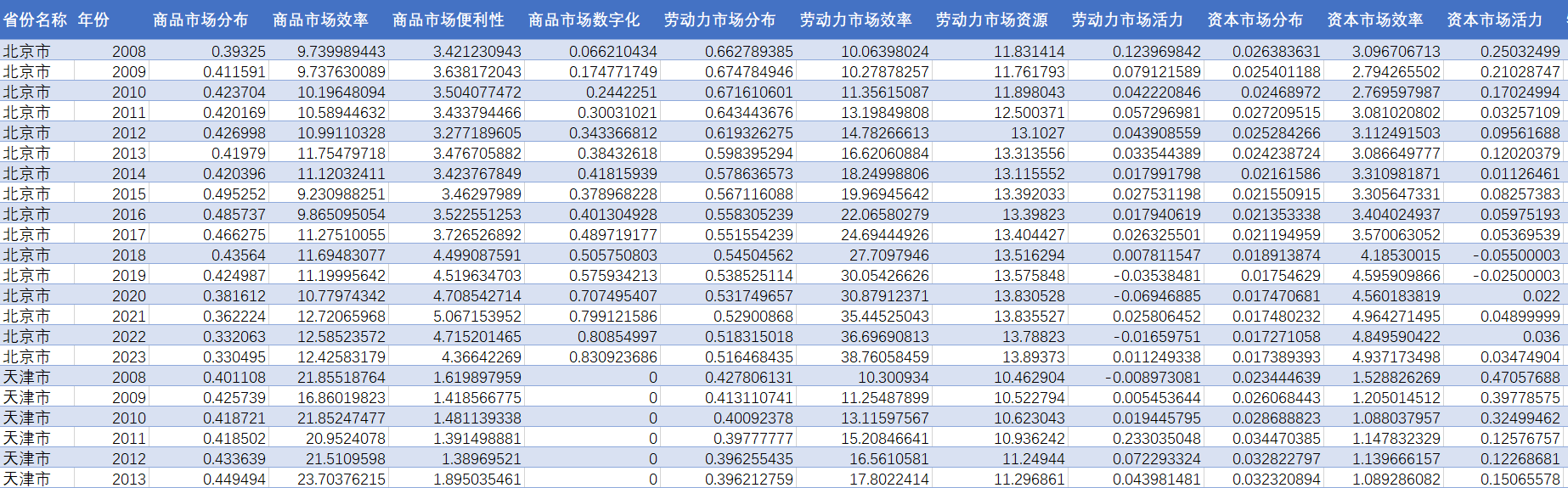 省份名称 | 年份 | 商品市场分布 | 商品市场效率 | 商品市场便利性 | 商品市场数字化 | 劳动力市场分布 |