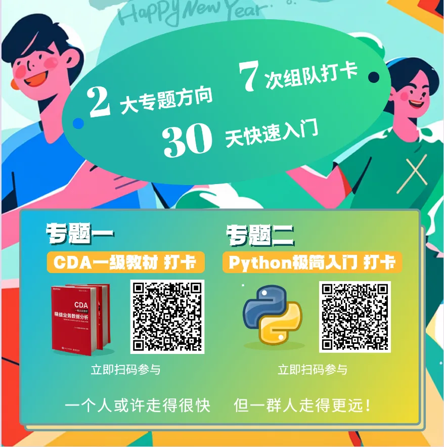 为了助力大家在数据分析领域不断精进技能,我们特别举办本期打卡活动。在这里,你可以充分利用碎片化时间在线学习,让学习在有序的节奏中稳步推进。按既定时间节奏打卡,能帮助我们养成规律的学习习惯,克服拖延与惰性;能构建起系统的学习框架,避免学习的盲目与无序;更能营造出积极的学习氛围,激励自己不断前行。以组队学习的形式,与志同道合的伙伴们携手共进,团队的力量将激发你的学习动力,让学习不再是孤独的旅程。大家相互监督、彼此鼓励,共同提升学习效果,一起精进自己在数据分析专业领域的技能。