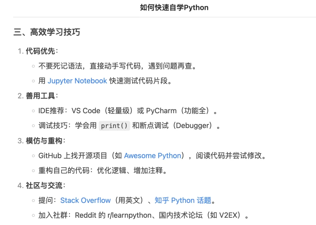 昨天问了Deepseek如何快速自学Python,它给的建议真的很实用,而且是按周计划的,简直就是小白自学路线图。