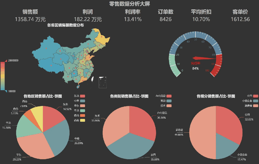 数据看板、仪表盘的设计和实现需要熟悉企业的业务,掌握指标的设计方法,这些内容在教材中有详细的介绍。本文作为教材的补充拓展给大家介绍一下如何基于Python工具包Pyecharts实现可视化看板,并实现看板实时刷新。最终效果如下图所示: