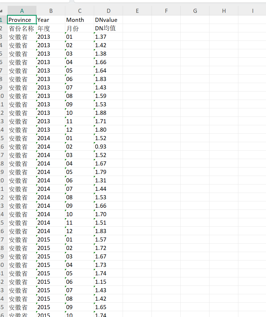 根据以上校正方法,分别对中国所有省份和地级市进行 DN 均值和灯光指数 进行数据提取。此处,对灯光指数的定义是指某区域内灯光斑块的平均相对灯光 强度(I)与灯光斑块面积占区域总面积比(S)的乘积
