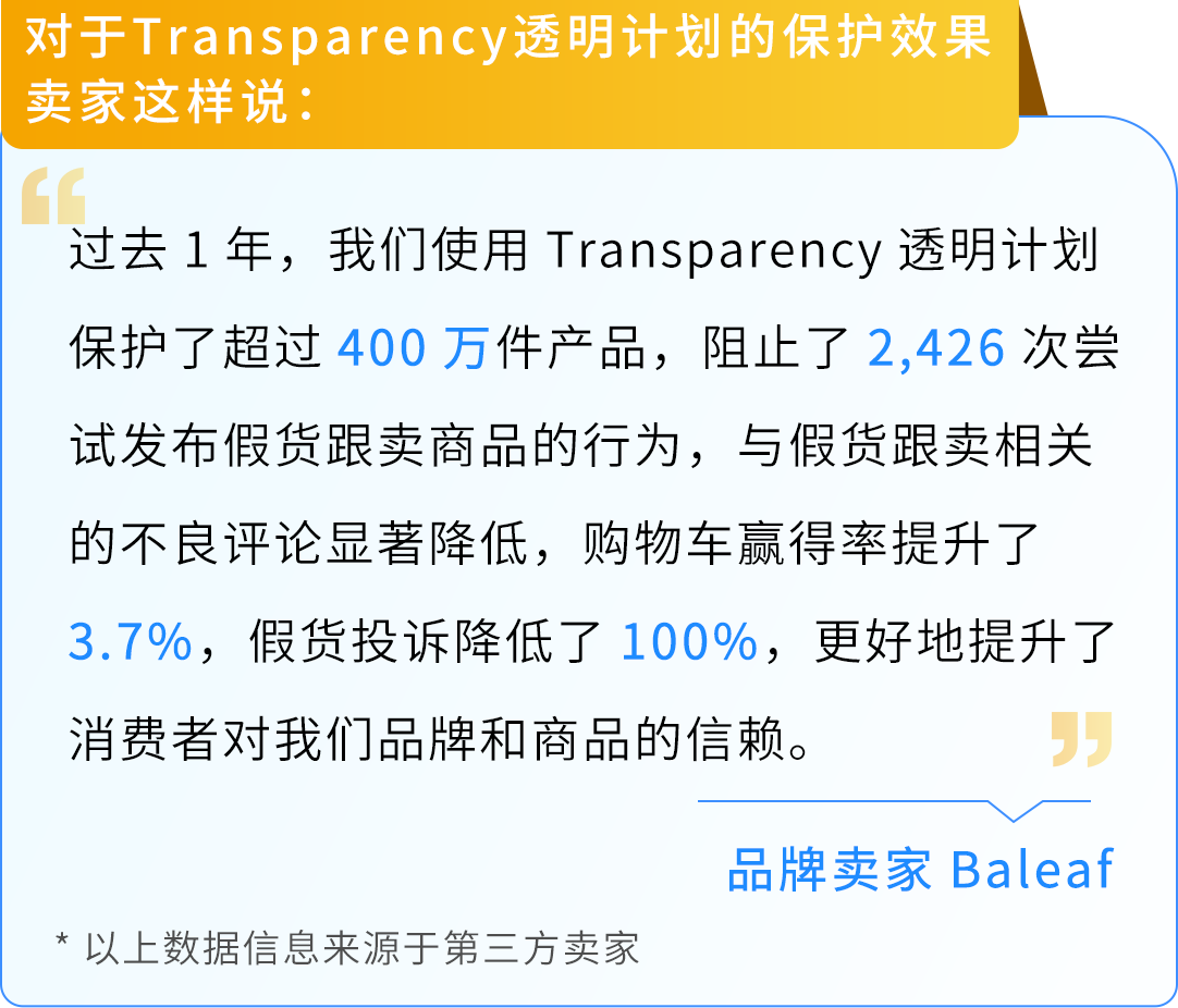 当下品牌选新品阶段,正是加入Transparency透明计划开启保护的黄金时机。由于新品通常库存较少以及无需额外清理旧库存,您可以用更低成本、更快速度开启保护,让您的品牌新品从一开始就占得先机。