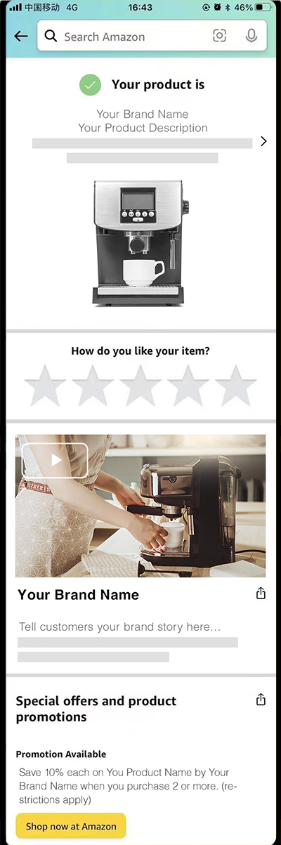 这个落地页功能十分强大!买家用亚马逊购物App扫描商品上的Transparency条码后,可以查验商品真伪,加强买家对品牌的信任。同时还可以一键留评,查看您的品牌视频、促销、Posts(帖子)等,关注您的亚马逊品牌旗舰店,助力复购和构建品牌私域流量。