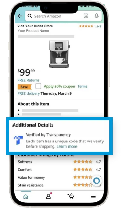加入Transparency透明计划后,您的每一件商品都会获得一个独一无二的专属代码。开启保护后: