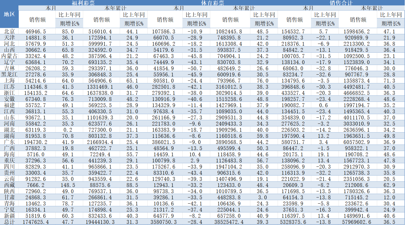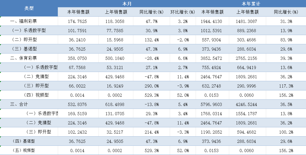 福利彩票 | 本月 | 销售额 |