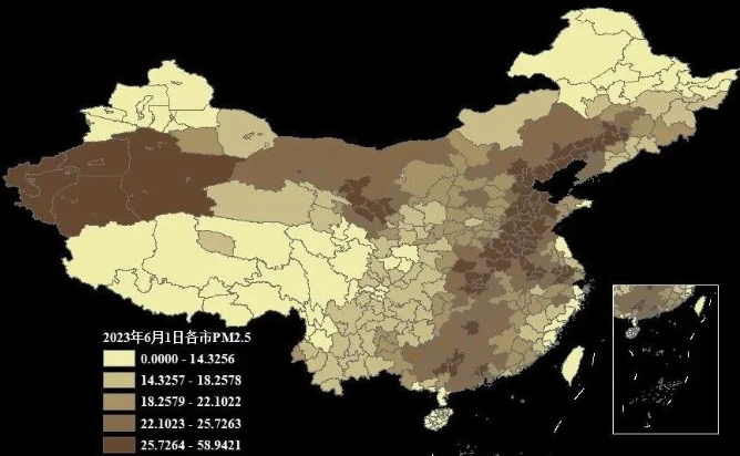 基于上述原始数据,我们采用国家地理信息公共服务平台(天地图)发布的审图号为GS(2024)0650号的2024年省市县三级行政区划Shp数据,分别汇总各个地级市内所有栅格日PM2.5的平均值,最终得到每个地级市的日PM2.5数据。
