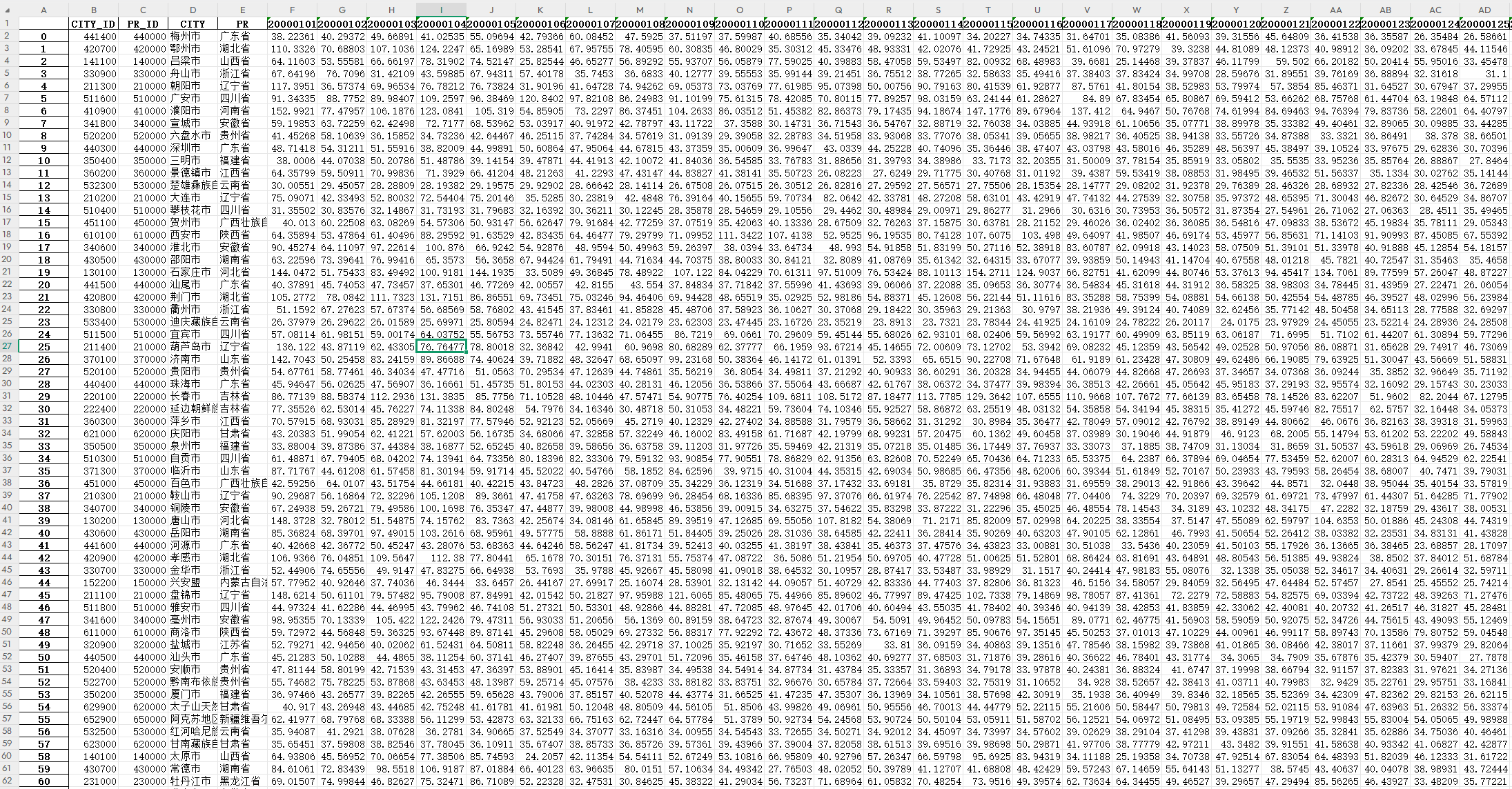 我们先以2023年1月1号——1月10号为例,来预览一下地级市层级excel格式的逐日PM2.5数据,数据字段包括城市名称、城市代码、省份名称、省份代码和每日PM2.5: