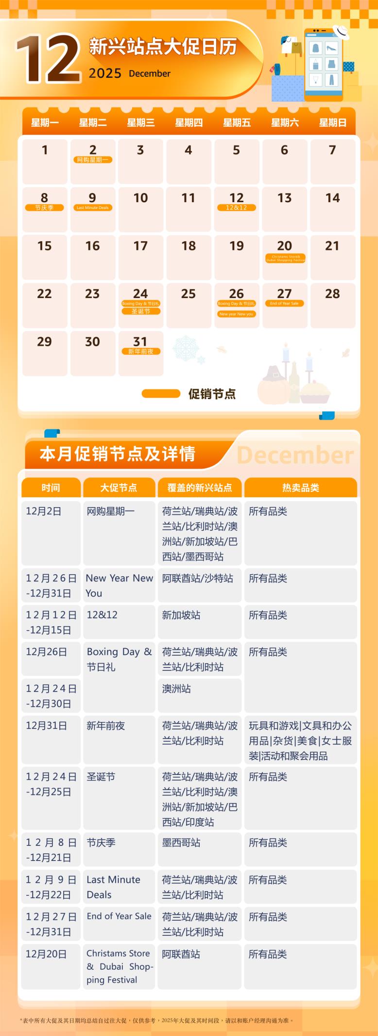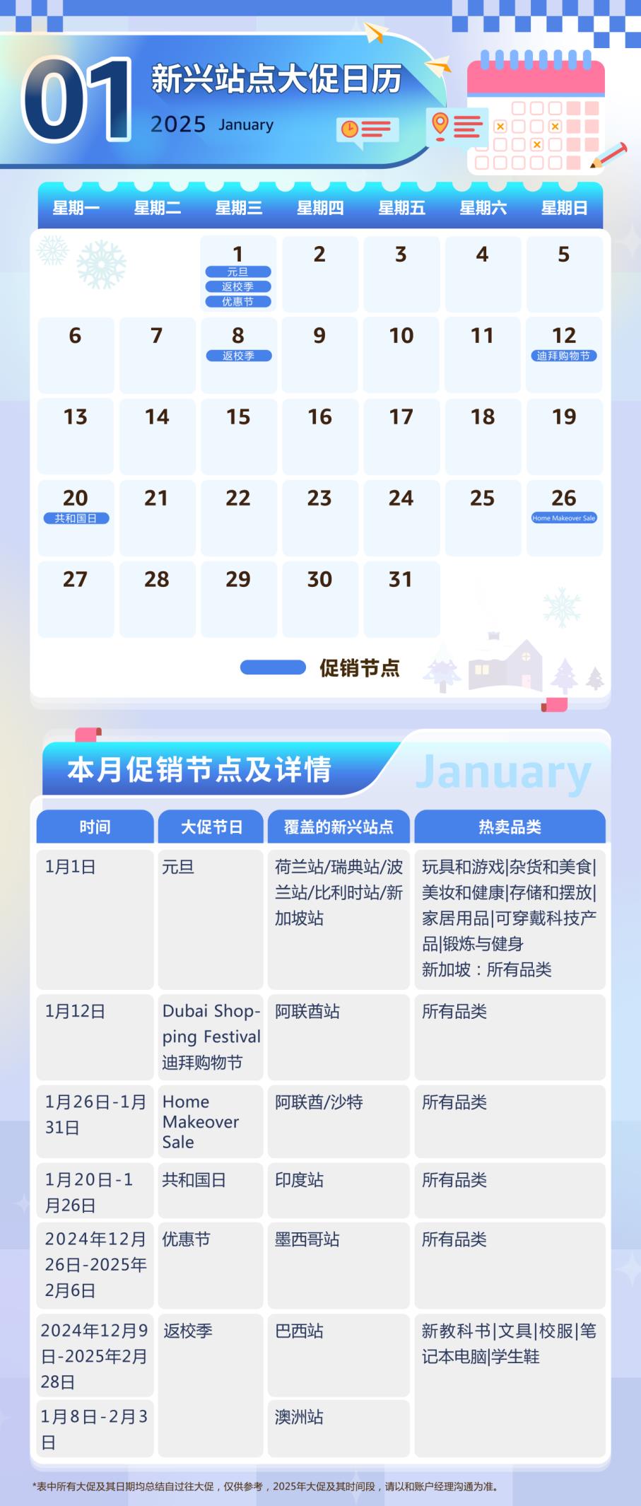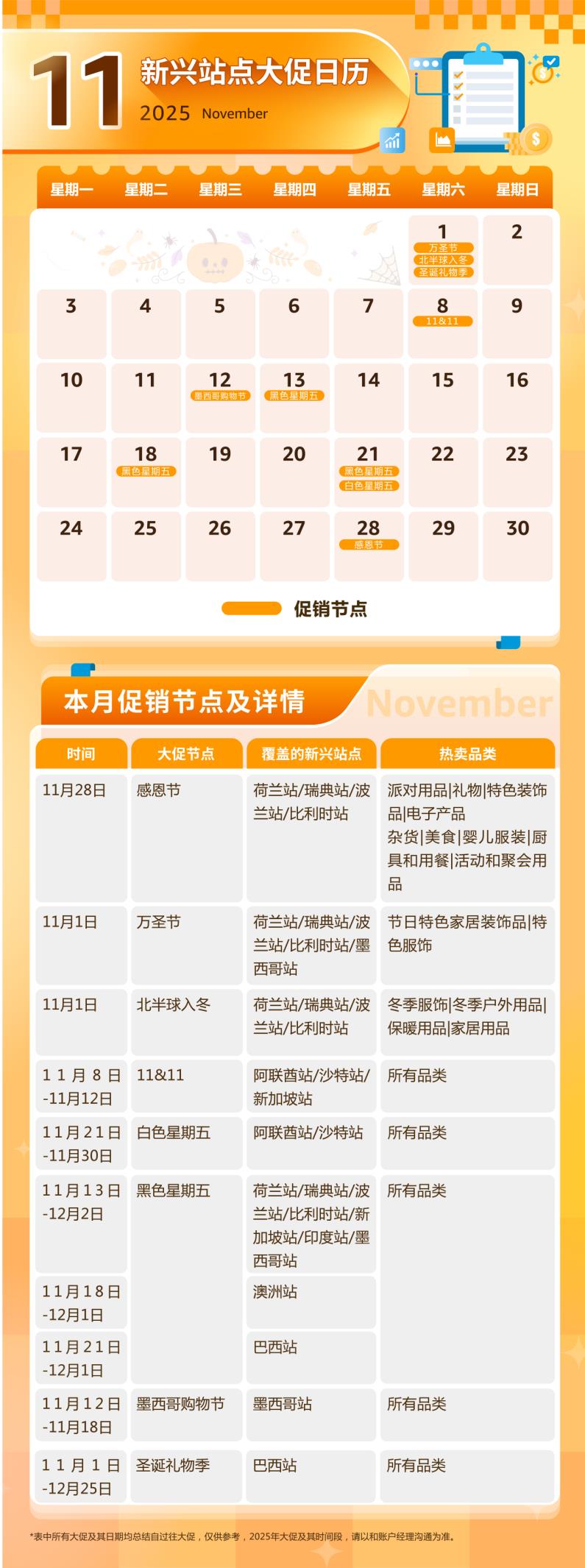 从1月的元旦、返校季到11月黑五网一,再到12月圣诞节,新兴站点全年促销无缝衔接,一个接一个,爆单机会不中断!